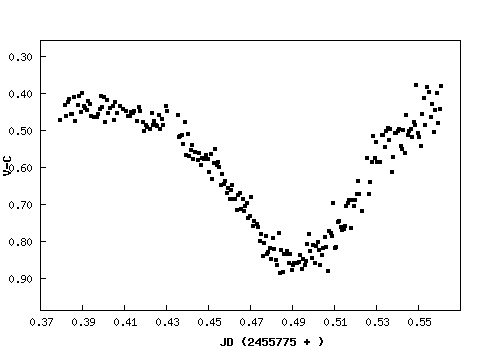 V hlavní kopuli jsme se vrhli na proměnku, klasický začátek práce se CCD na Expě. Vybrali jsme si hvězdu s názvem DO Cas, hvězda s hvězdnou velikostí 8,4-9,1mag a periodou 0,68 dne se nám zdála jako příhodný cíl a její čas minima 0:32 UT nám také poměrně vyhovoval. Jednalo se o proměnou hvězdu typu beta Lyr, tedy zákrytovou dvojhvězdu s primárním a sekundárním minimem. Proto jsme na ni namířili dalekohled. Po chvíli tápání v hvězdném poli jsme ji konečně našli a začali snímat.Tvar světelné křivky nás ze začátku zaskočil, ale pak jsme vše srovnali s daty jiných pozorovatelů a myslím, že na naši práci můžeme být hrdí.