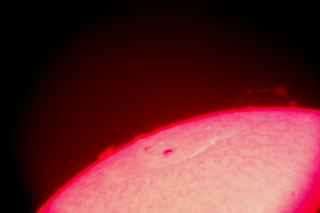 V úterý se Slunce po dlouhé době uráčilo vykouknout zpoza oblačnosti, a tak se otevřela štěrbina hlavní kopule a dalekohledy se jaly tento jev pozorovat. Není totiž žádným tajemstvím, že se v těchto dnech přes sluneční kotouč proháněla obří skvrna. Právě okolí této skvrny se mi s spolu s protuberancemi podařilo zachytit na videokameru. Ta byla afokálně přichycena u okuláru Coronada.