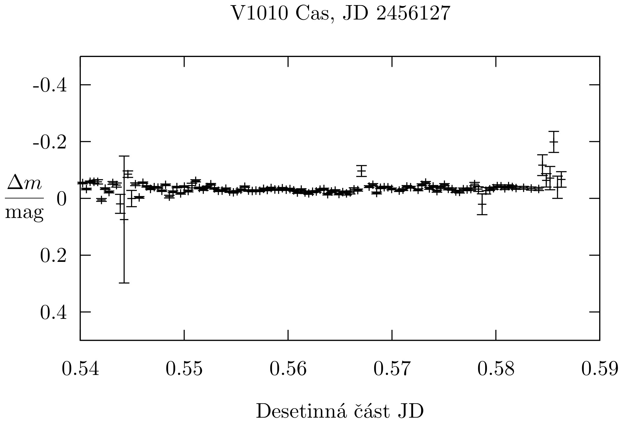 Poté jsme se rozhodli nasnímat proměnnou hvězdu V1010 Cas. Tato hvězda je v databázi na var.astro.cz označena koeficientem 10, je tedy velmi málo pozorovaná. A to se nám vymstilo, neboť sem tam se v databázi objeví jakýsi šotek, který přidá špatnou předpověď minima. Máme tedy téměř dokonale rovnou světelnou křivku.
