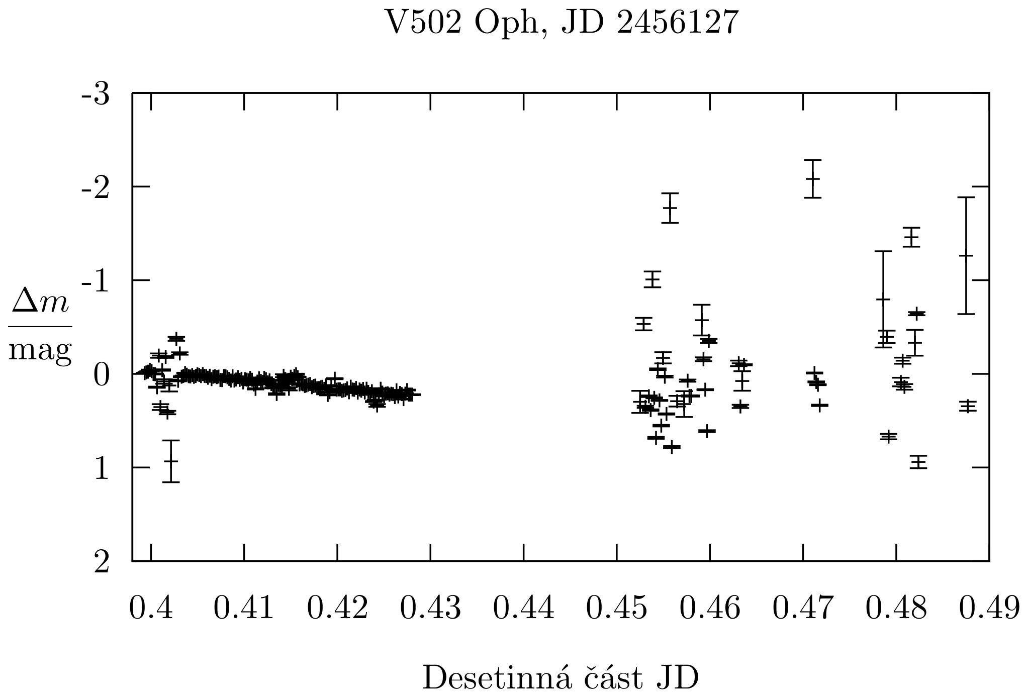 V noci z 18.7. jsme se rozhodli na CCD G2-1600 umístěné v hlavní kopuli na SW 120/600 udělat fotometrii proměnných hvězd. První, která přišla na ránu, byla V502 Oph. Pozorovatel zapnul snímání a odešel na půlnočku a poté na pozorování šikmé bulvy na louku. Když se po cca 45 minutách vrátil do kopule, zjistil, že OS Windows 7 se zase jednou snažil být chytřejší než uživatel, a protože neměl žádnou odezvu z klávesnice ani myši, rozhodl se uspat počítač ignoruje přitom běžící kameru. Bohužel se tato pauza trefila přesně do minima. Pravděpodobně ale máme začátek poklesu zaznamenaný.