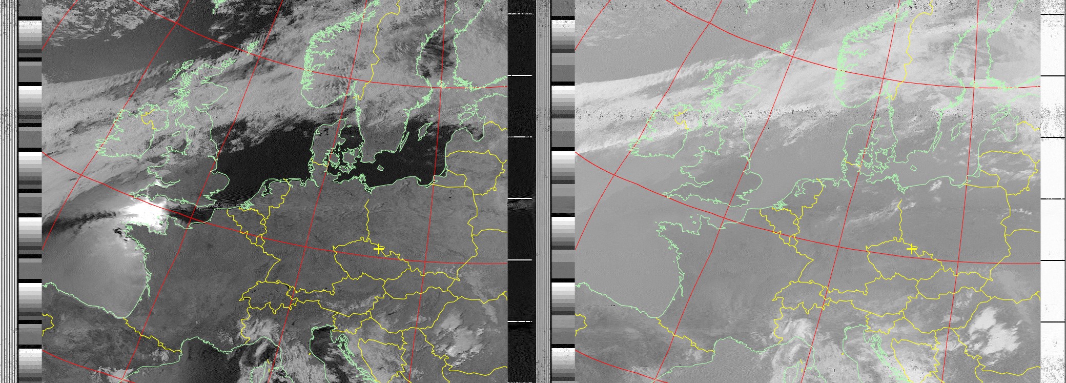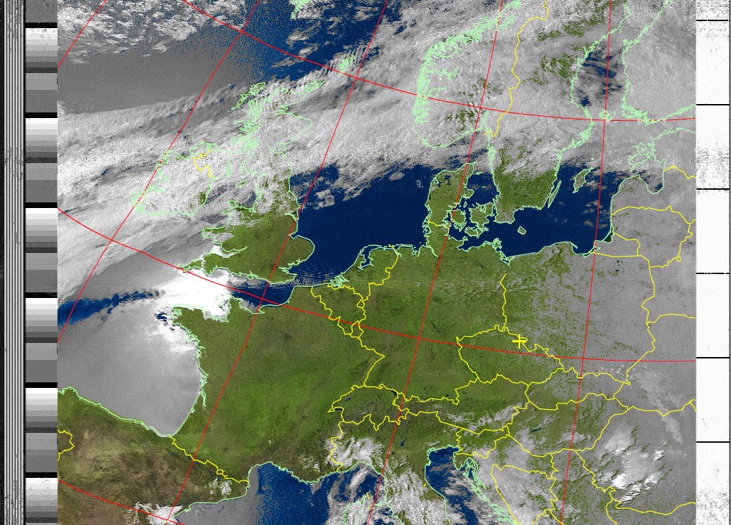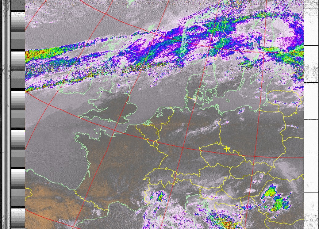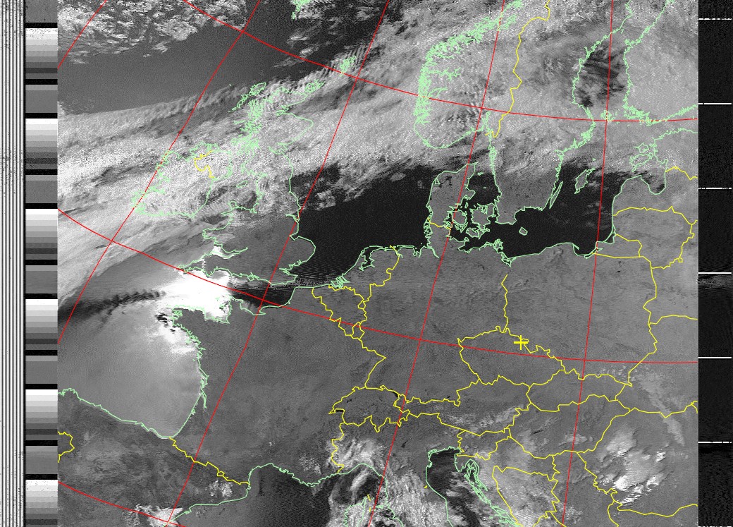 Dnes se podařilo rozchodit příjem snímků z meteorologických družic NOAA. Bylo potřeba postavit vhodnou anténu, která je teď umístěna na stožáru vedle radioboudy (ta s tvarem kosočtverce). Problem s nedostatky hardwaru se vyřešil tandemovým zapojením dvou PC za sebe tak, aby se data mohla zpracovávat in-line. Čerstvé snímky z oběžné dráhy pak vypadají takto