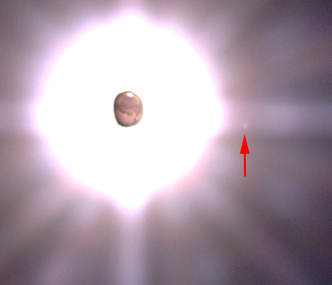Výsledkem je tato složenina z dvou různých snímků s rozdílnou expozicí. V centru je vidět samotná planeta Mars (pořízeno krátkými expozicemi) s albedovými útvary a polární čepičkou, je též vidět fáze planety. S delší expozicí je samotná planeta silně přeexponována, ale objevil se měsíček Deimos. Bližší měsíc Phobos (Strach) je skryt v záři planety.