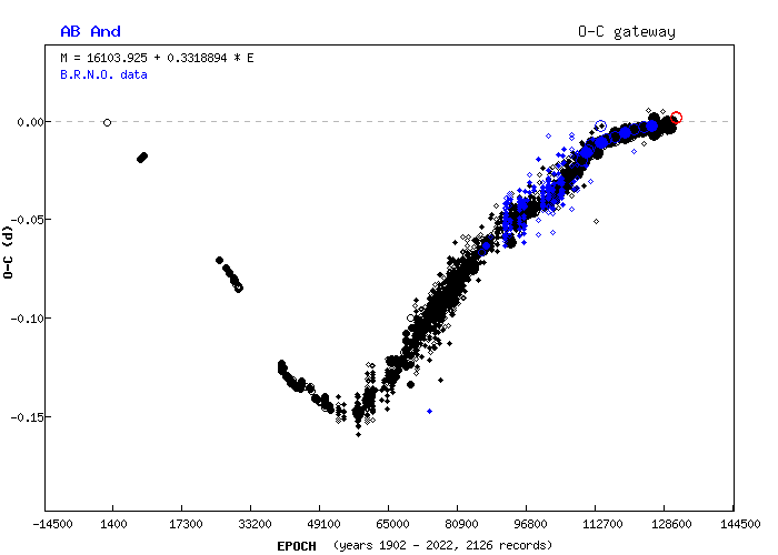 O-C diagram AB And, červeně je vyznačeno námi naměřené minimum.