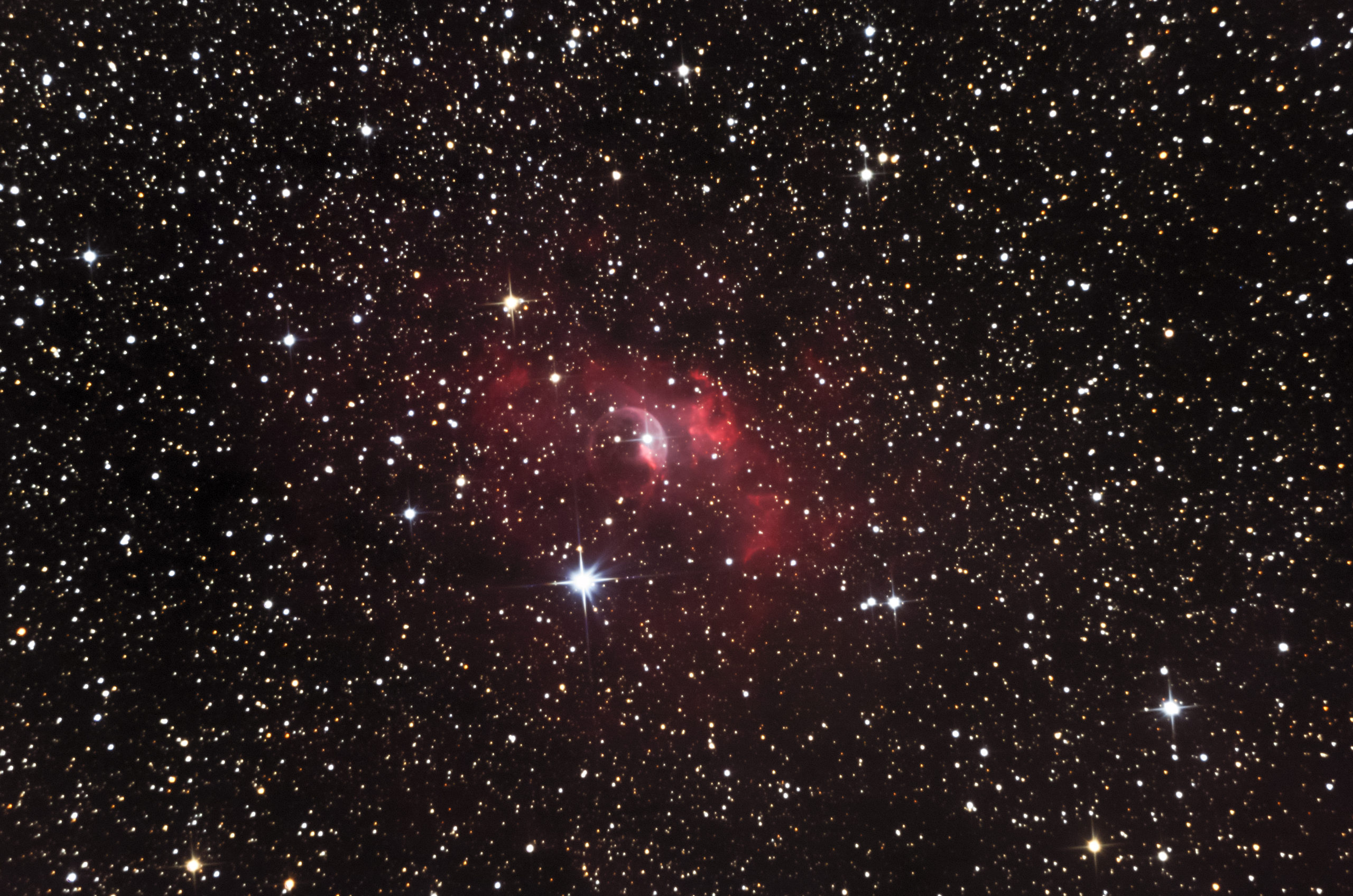 Mlhovina Bublina je emisní mlhovina v souhvězdí Kasiopeji. Leží ve vzdálenosti více než 7 000 ly, její hvězdná velikost je zhruba 10 mag. Focena byla na modifikovaný Canon EOS 600D přes dalekohled Newton 250/1200, celkový expoziční čas je 2,5 h na ISO 800. Zpracování: Siril, Photoshop
