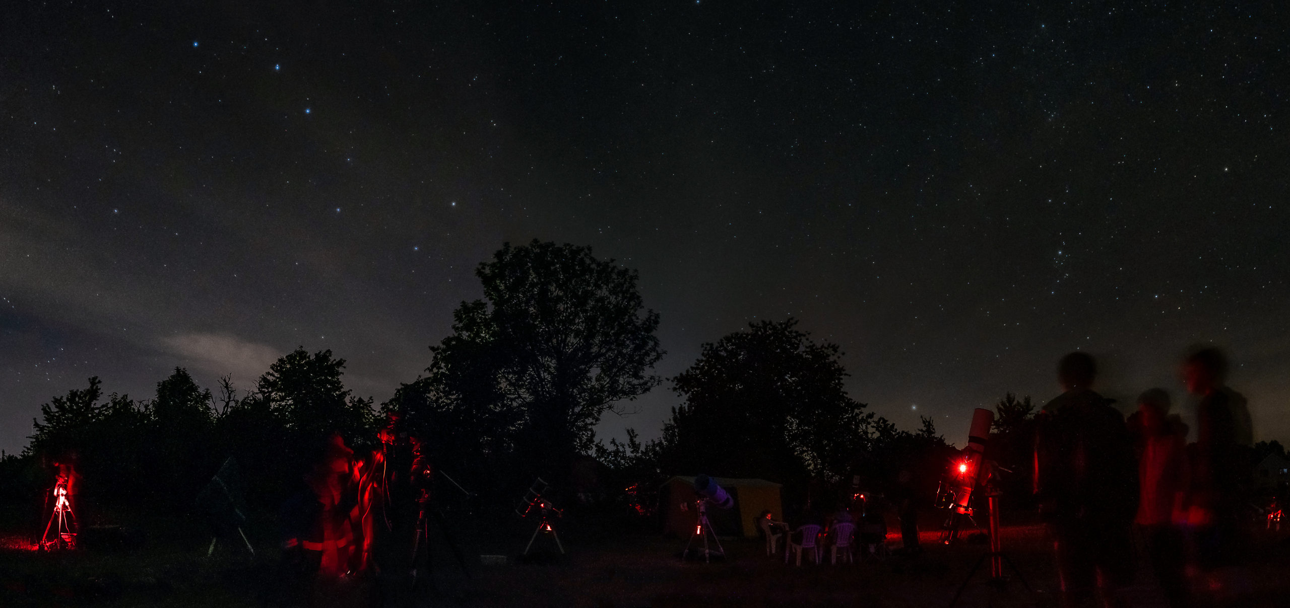 Menší “panorama” digi foto skupiny na louce v noci z 2. na 3. srpna. Úplně vpravo je vidět skupinka obdivující dalekohled Honzy Veleby (který v tu chvíli fotil mlhovinu Severní Amerika), za kterým pak vykukuje MUMO (Masaryk University Mobile Observatory). Nalevo od něj se tyčí další tři “velké sestavy”, tedy sestavy s dalekohledy, mezi nimi…