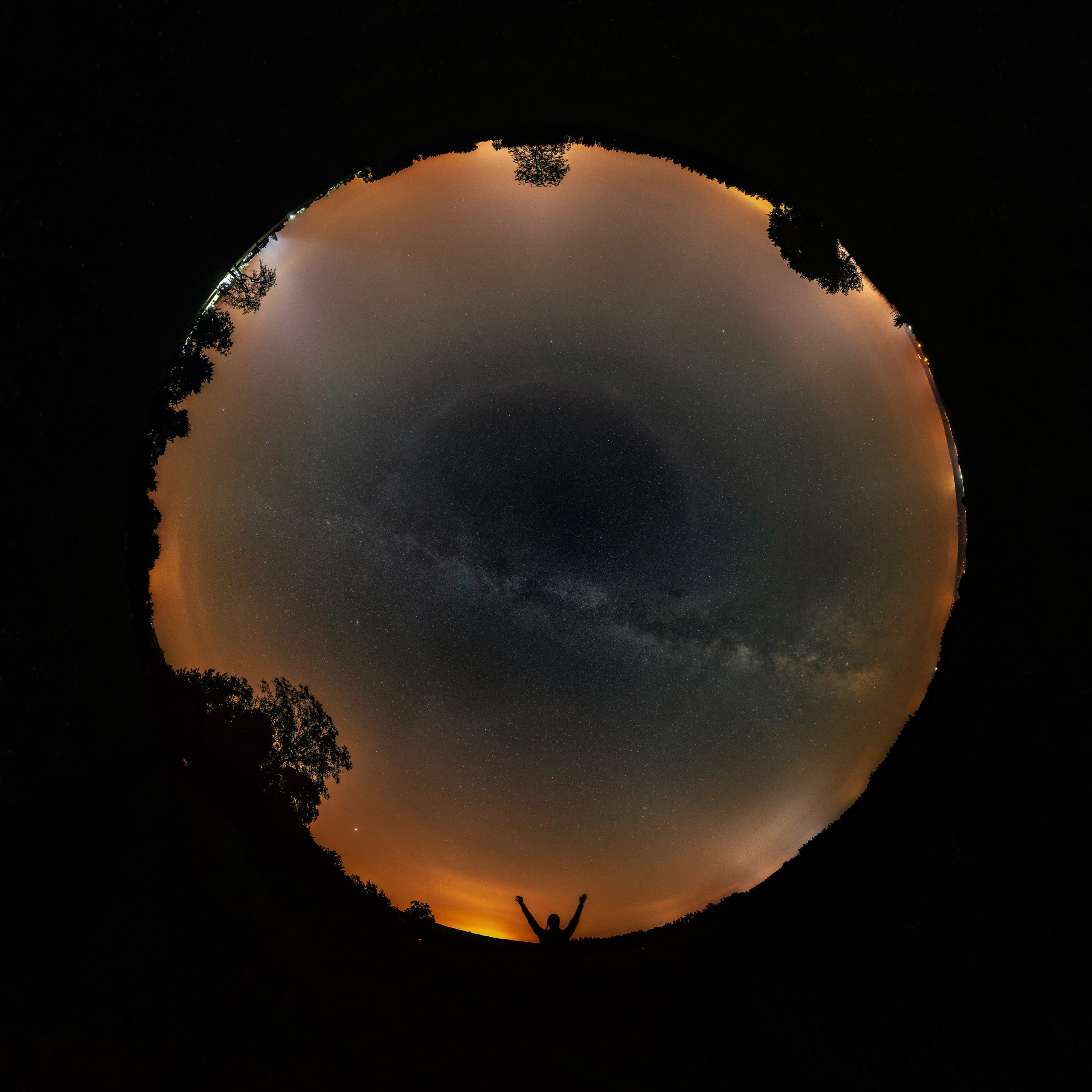 Noční obloha na Astronomické expedici (Sítiny) má jas průměrně 21.04 mag/arcsec2* a na jižním okraji Prahy (osada Jarov) má noční obloha jas cca 18,5 mag/arcsec2*. Co to ale znamená a jak moc velký rozdíl to vlastně je? Chci vám to ukázat vizuálně. Mám dvě celooblohové fotky ve stylu „okno do nebe“, jednu z letošní Expy…