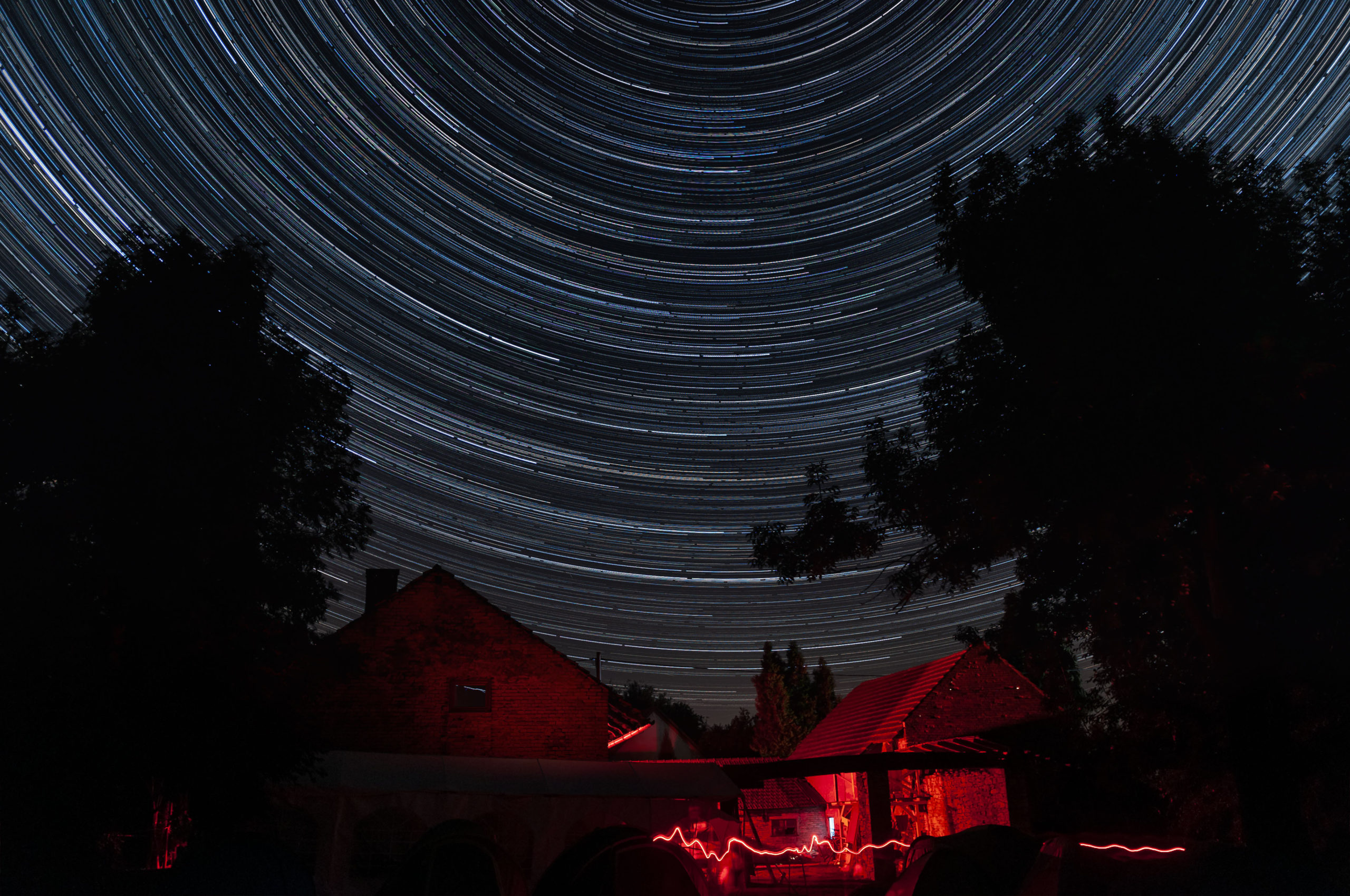 Startrails nad budovami během první (jasné) pozorovací noci 24.7., na louce už touto dobou digi foto skupina pilně fotila.