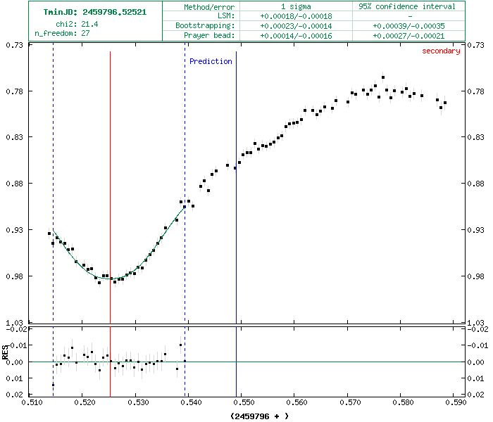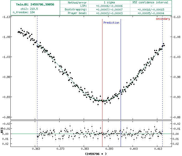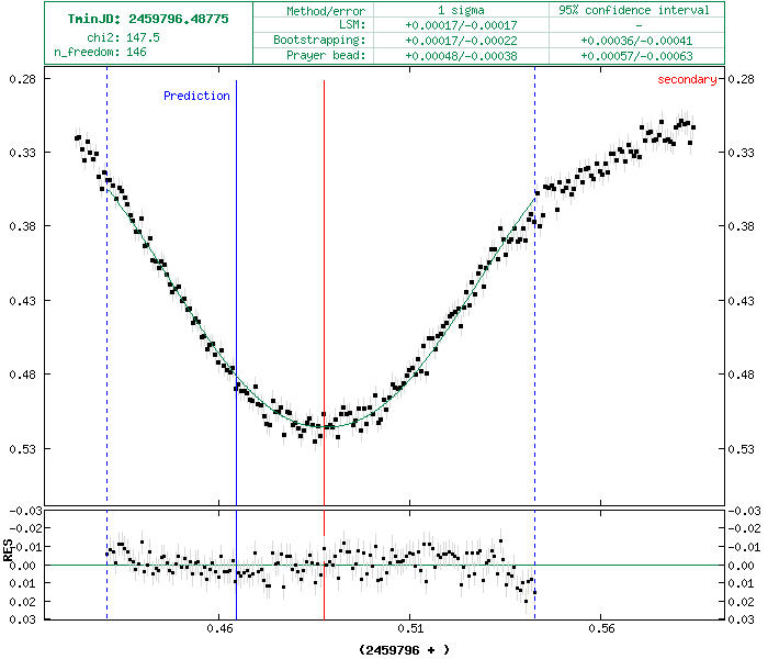 O-C diagram BX Tri, červeně je vyznačeno námi naměřené sekundární minimum.
