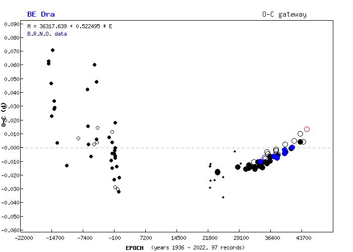 O-C diagram BE Dra, červeně je vyznačeno námi naměřené sekundární minimum.