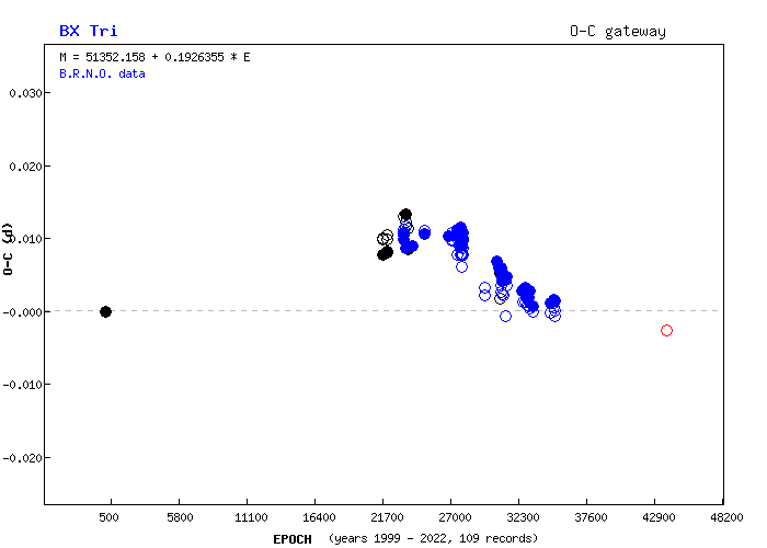 Díky brzkému začátku tranzitu jsme nad ránem měli dostatek času ještě na opravdu rychlou zákrytovku. Naprosto ideálním kandidátem pro toto pozorování byla BX Tri, eruptivní dvojhvězda složená ze dvou červených trpaslíků vykazující navíc změny v O-C diagramu