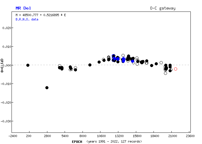 O-C diagram MR Del, červeně je vyznačeno námi naměřené sekundární minimum.