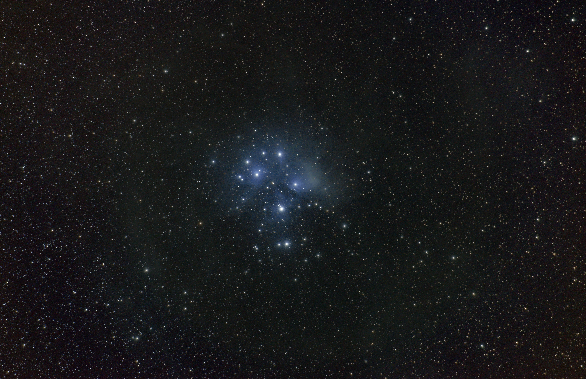 Svoji přehlídku těch nejznámějších objektů, které nám letní obloha dokáže nabídnout, jsem v pozdních nočních hodinách rozšířil i o fotku M45, neboli Plejád.