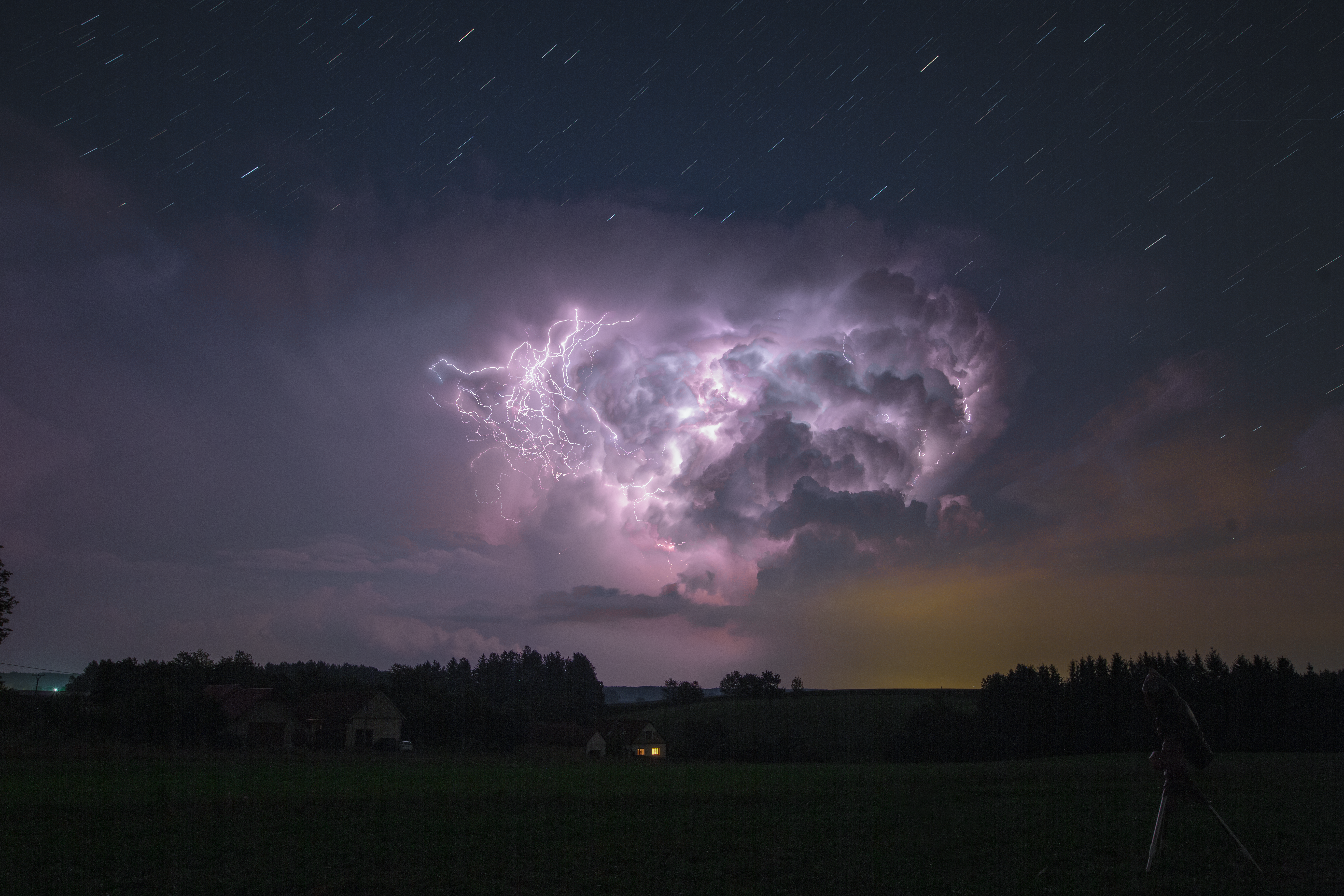 Asi málokdo na expedici si nevšimnul krásné supercely v úterý 22.8.2023. Většina expedice seděla venku na poli a kochala se blesky, kterých bylo opravdu nespočetně a díky poloze supercel (které nebyly přímo nad námi, ale naopak mířily směrem od nás) jsme je mohly sledovat z bezpečné vzdálenosti a v suchu. Několik z nás jsme proto dali příležitost vychutnat si bouřku i křemíkovým senzorům. Výsledkem je například takováto fotografie, což by se dalo také kategorizovat jako startrails. Za zhotovením takové fotografie stojí prolnutí 9×20 sekund snímků při ISO 400 a cloně 6.3, focených na Canon 6D, Sigma 24mm. Výsledná fotografie vznikla pouze v Adobe Photoshop za kreativní spolupráce Michala Šrejbera a technické spolupráce Pavla Váni.