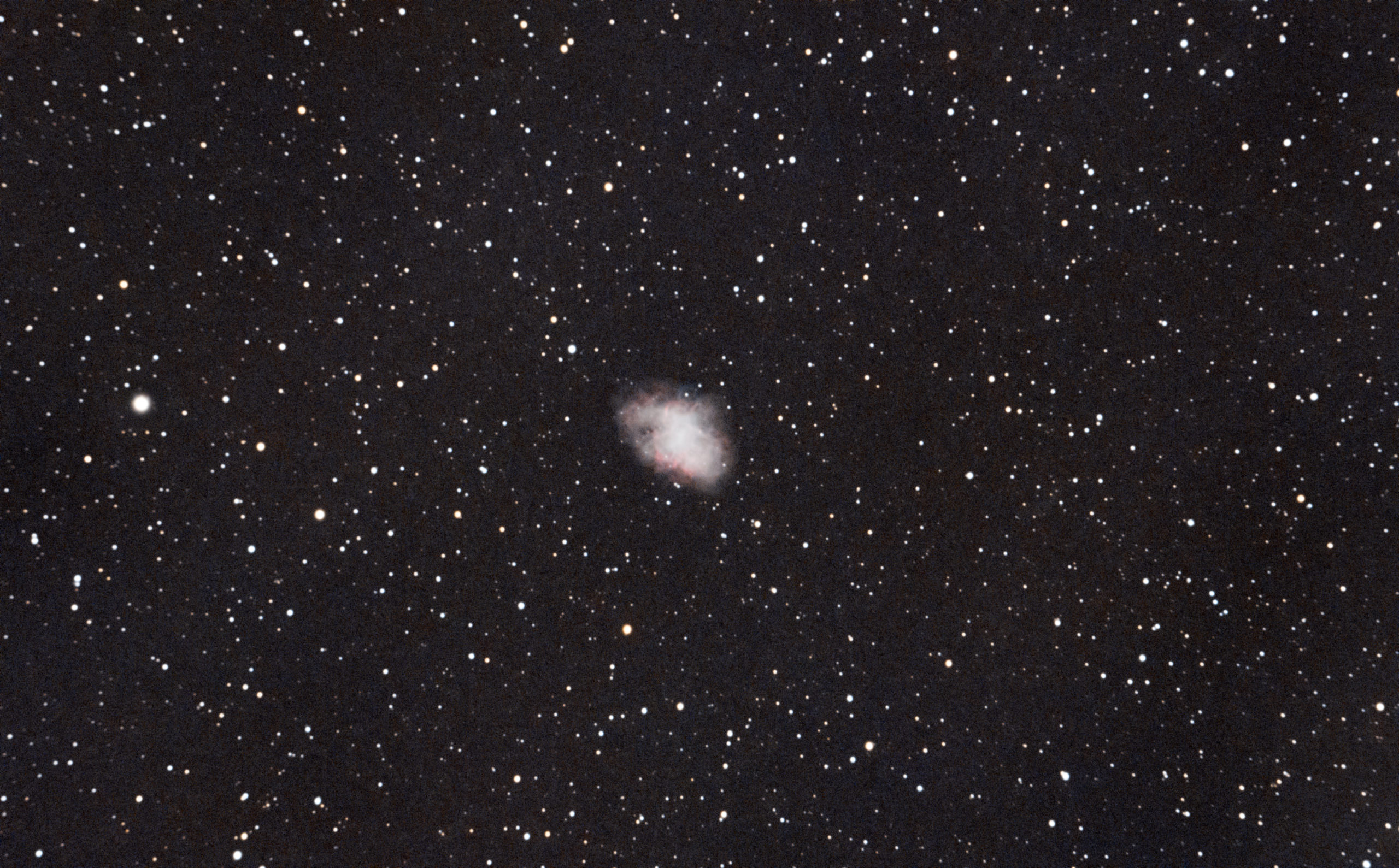Letos jsme se dokonce pokusili o zachycení Krabí mlhoviny v souhvězdí Býka (M1). Výsledný obrázek je výsledkem zhruba hodiny sběru dat na kameře Touptek 2600CP, dalekohledu TS Photoline Apo 115mm f7, guiding, na gain 100. Úpravy klasicky provedeny v PixInsight a Adobe Photoshop.