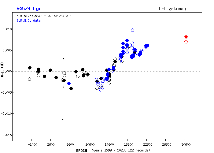 O-C diagram pro V0574 Lyr. Námi získané časy minim jsou vykresleny červeně. Primárnímu minimu odpovídá plný bod, sekundární je vyznačeno bodem prázdným.