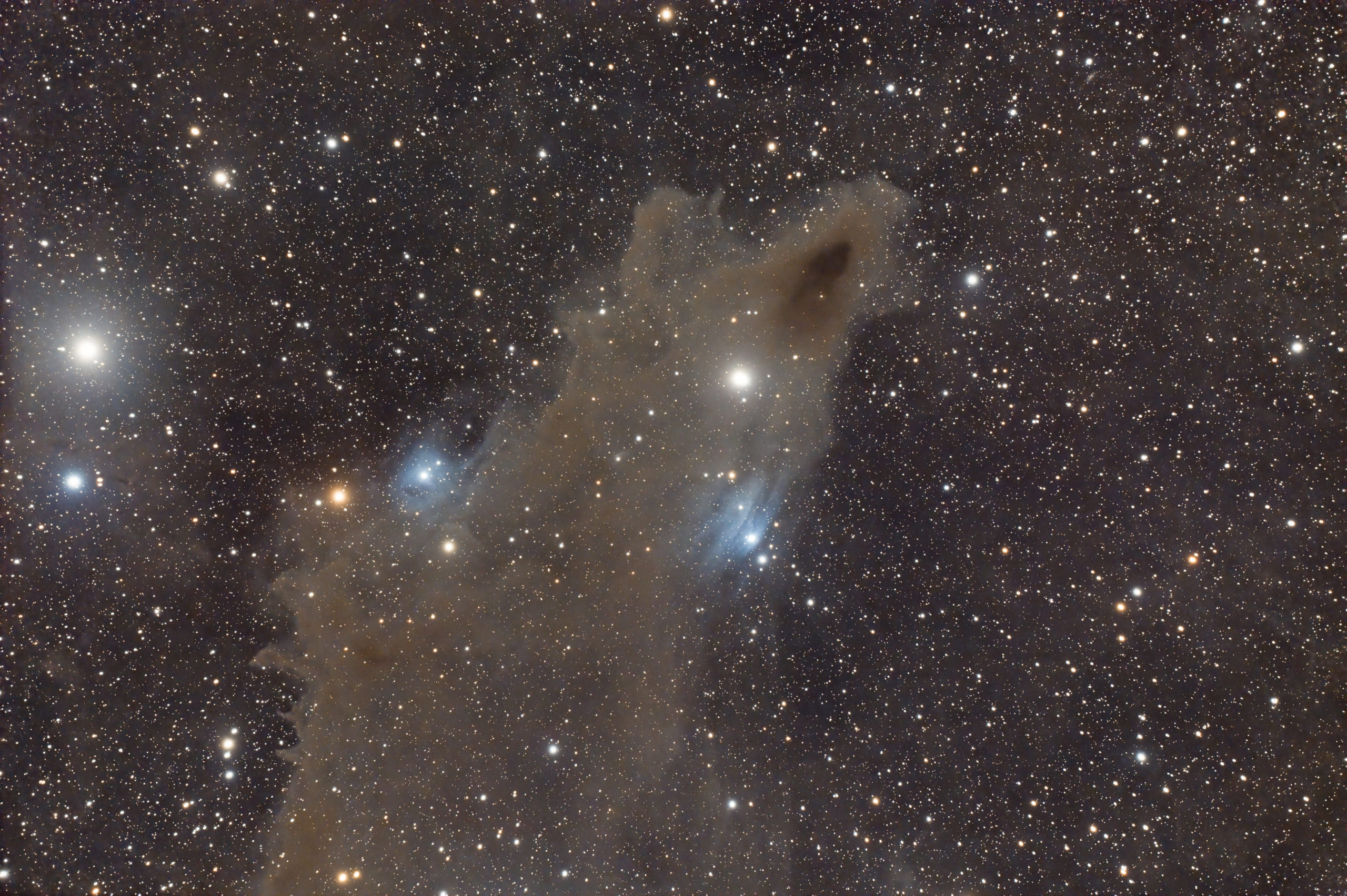 Fotografická sestava S.A.J.R.I se po roce opět probírá k životu a toto je první fotografie na ní pořízená na letošní expedici, snímek temné mlhoviny žralok ze souhvězdí Cefeus (LDN 1235) 84 x 180s, Gain 100, -5°C, + korekční snímky TS Photoline Apo 115mm f7, reduktor a rovnač, kamera Touptek 2600CP, pointace na 138mm na ZWO…
