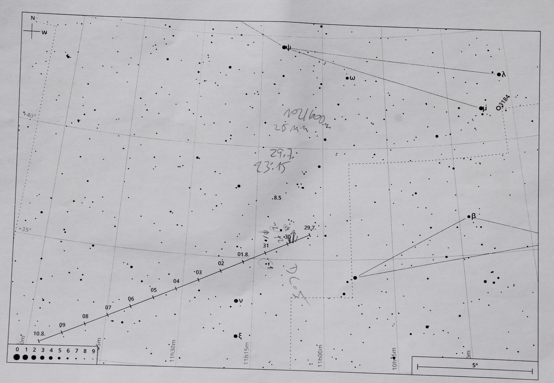 Pokusil jsem se o vizuální odhad jasnosti komety 13P/Olbers, která je aktuálně nejjasnější kometou na obloze. Kometa se pohybuje nevysoko nad severozápadním obzorem. Jasnost vyšla na 6,8 mag. Pozorování bylo provedeno pomocí refraktoru Bresser 102/600mm, 25mm okulár (zv. 24×). 13P/Olbers: 2024 Jul. 29.89 UT: m1= 6.9, Dia.=3.5′, 10-cm Refractor (24x), Tail: 14 min. in p.a.…
