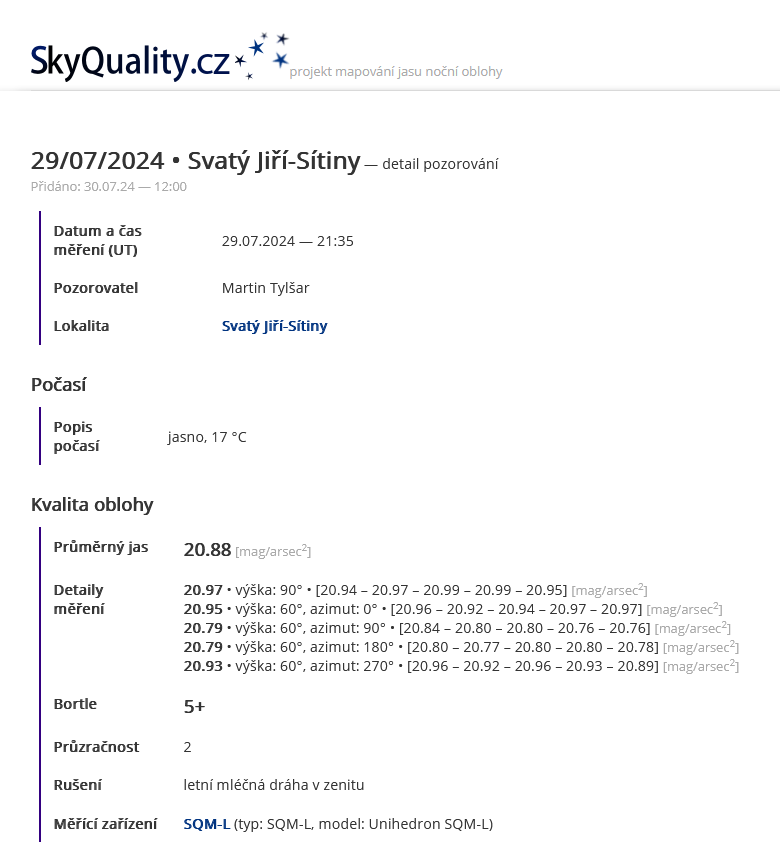 Po více než měsíci, kdy nad územím ČR nenastávala astronomická noc, se nám včera naskytla opět příležitost, toto měření provést.