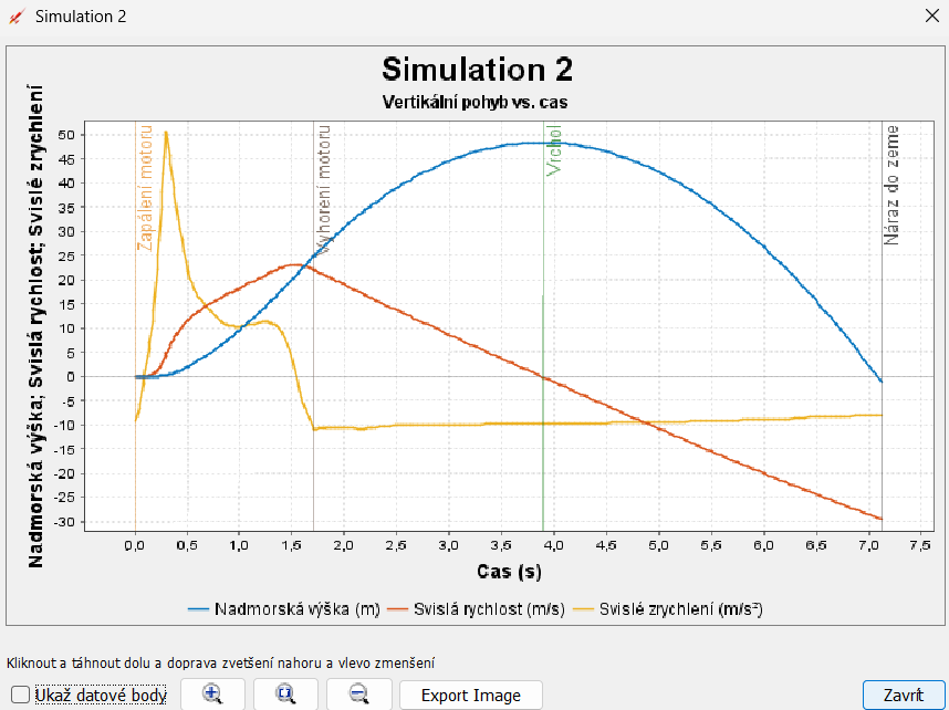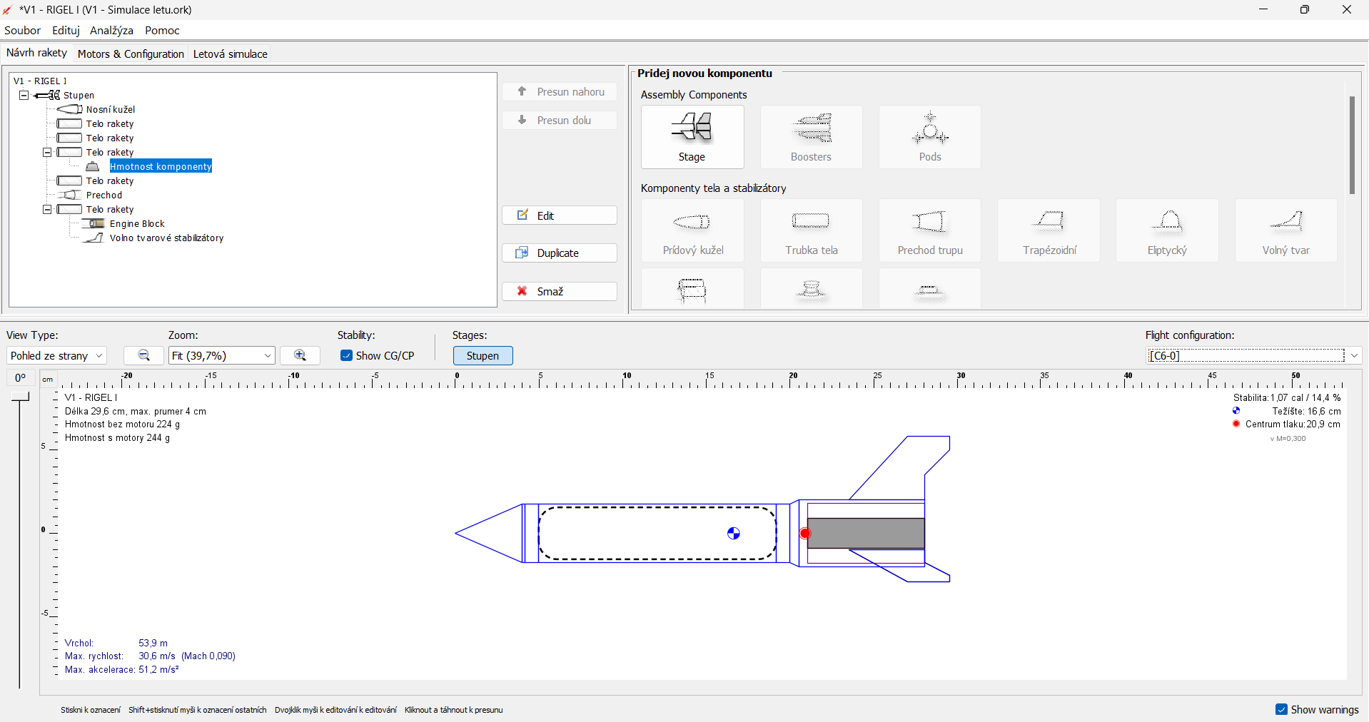 Vybrali jsme nejsilnější motor, který jsme měli, co byl motor C6-5 od KLIMA. Motor má impulz 10N a hoří 1,6sec. Jeho hmotnost je 20g.