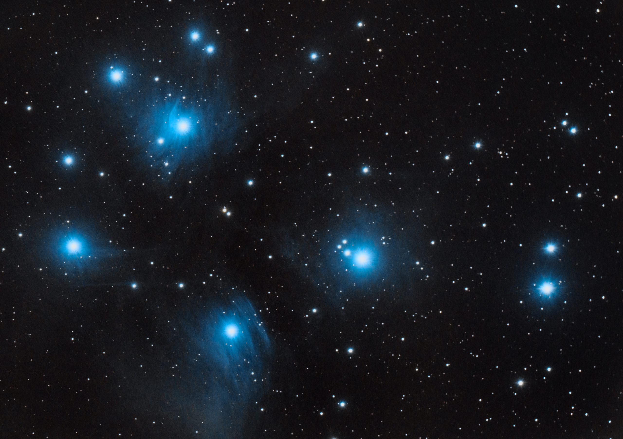 Plejády, v Messierově katalogu označeny číslem 45, jsou otevřená hvězdokupa, která je obklopena reflexní mlhovinou. Plejády jsou od Země vzdáleny pouhých 440 světelných let a nachází se v souhvězdí Býka. Zároveň jsou jako jedny z mála deep-sky objektů pozorovatelné pouhým okem. Celková doba expozice čítá jednu hodinu po 60 sekundových expozicích. Využitá sestava je tvořena kamerou Sony A7RII a Maksutov-Newtonem 190/1000.