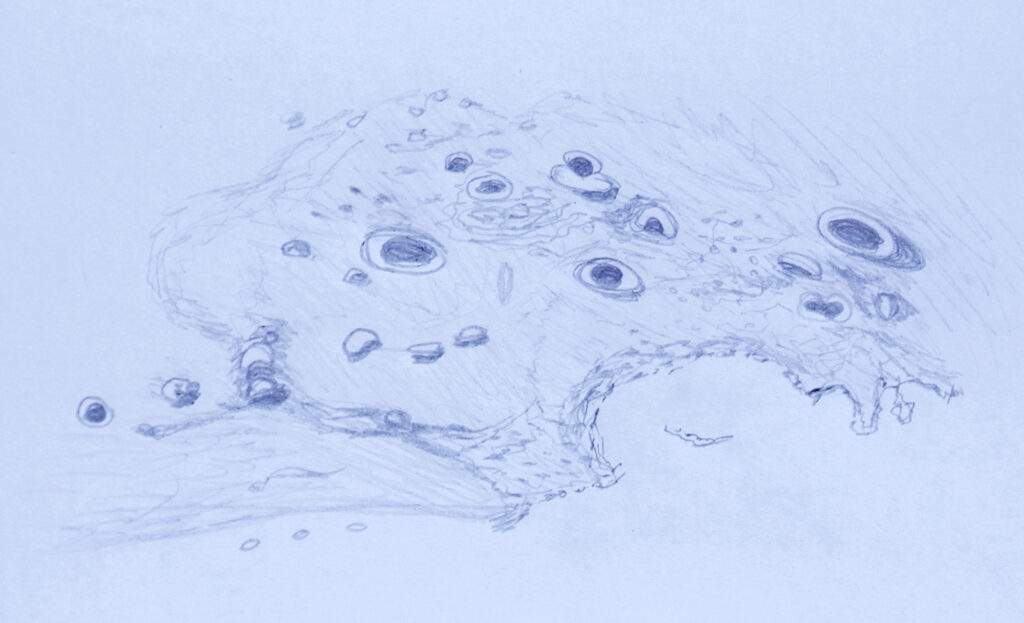 Měsíční Záliv duhy (Sinus Iridum) ze dne 19. 8. 2025, 3:15 SELČ, kreslila Karolína Faitová.