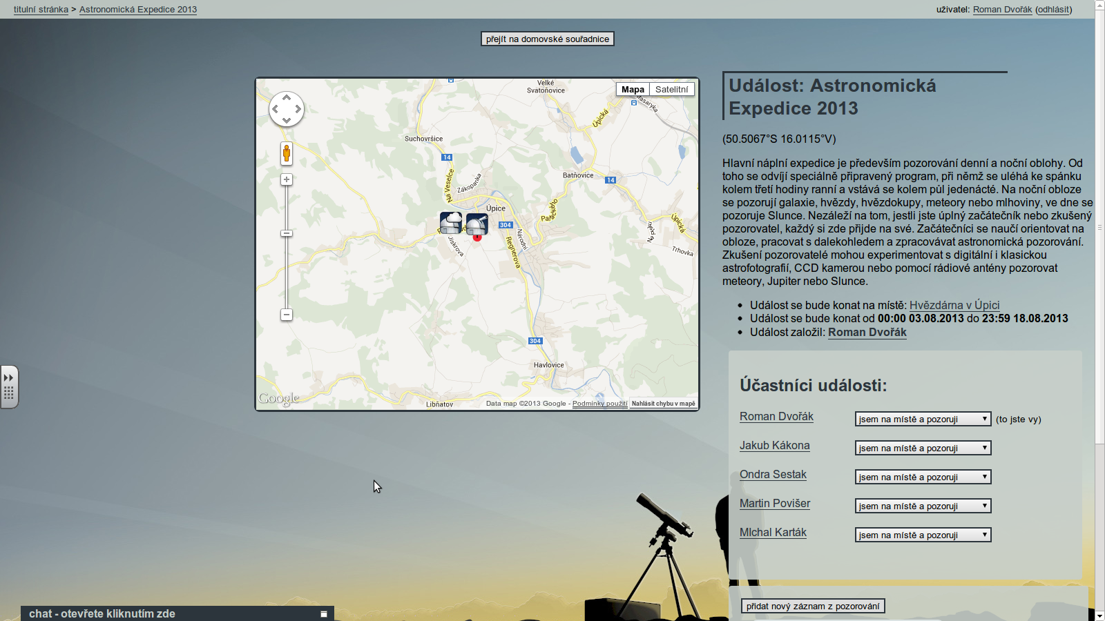 Skupina Radioastronomie pripravila aplikaci pro chytre telefony s OS Android aplikaci, která slouží k optickemu pozorovani meteoru. V průběhu expedice je cil porovnat zaznamy z uskutecnenych optickych pozorovani s radiovym pozorovanim, ktere na Upicke hvezdarne funguje jiz nekolik let. Aplikaci nainstalujete tak, ze se pridate do skupiny „Astronomicke Expedice“ na Google+ a pote aplikaci naleznete…
