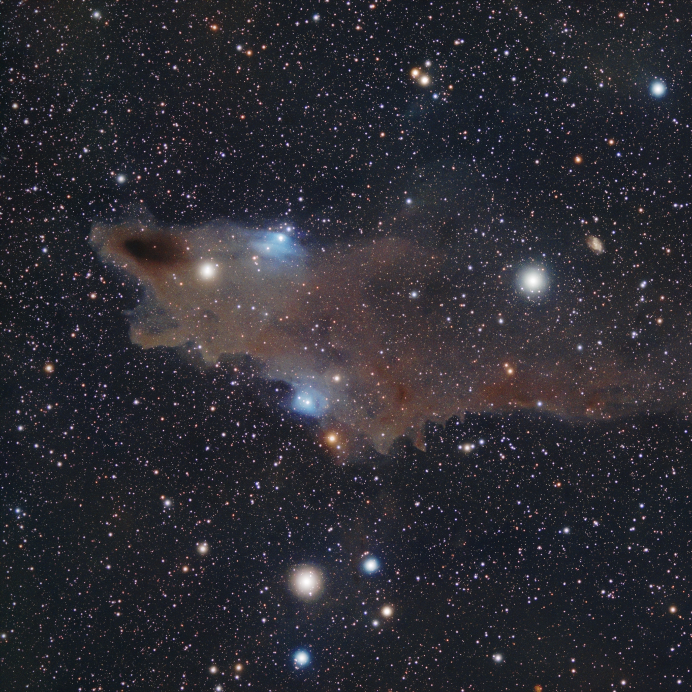 Během posledních tří jasných nocí letošní Expy jsme mířili teleskop do souhvězdí Cefea na mlhovinu Temného žraloka, LDN 1235. Výsledkem je následující fotka: Vybavení: SW EQ6-R, TS 76EDPH, QHY294M, Antlia LRGB 15 h expozice
