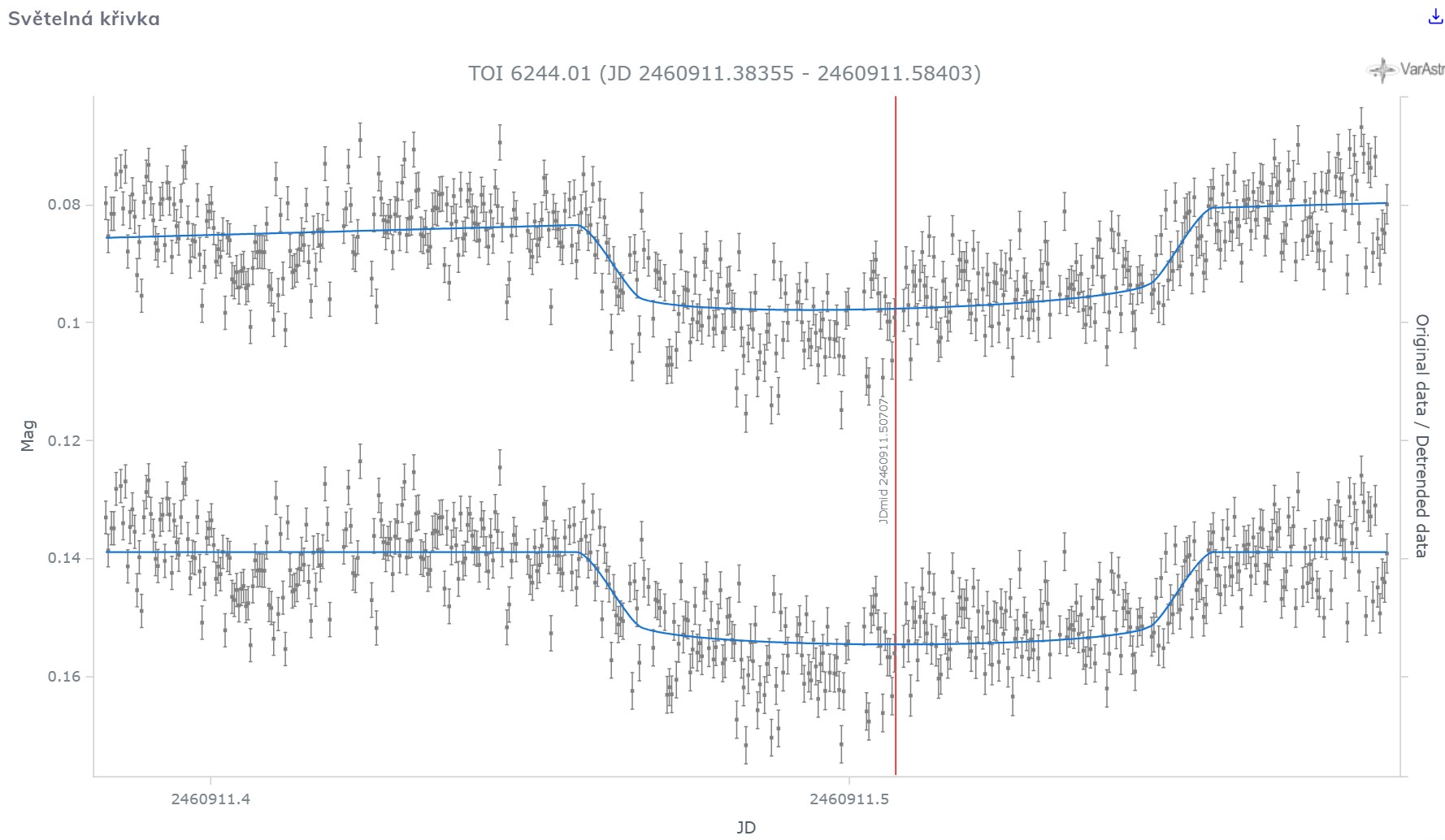 V průběhu Expy se podařilo zaznamenat tranzit exoplanety TOI 6244.01. Na světelné křivce (grafu, který ukazuje změny jasnosti hvězdy v čase) je vidět drobný pokles jasnosti způsobený tím, že exoplaneta na chvíli zakryla část disku své mateřské hvězdy. Pozorování provedl Martin Tylšar ze skupiny SciGi pomocí dalekohledu Ritchey-Chrétien 153/1370 mm. Fotometrické snímky byly pořízeny kamerou…