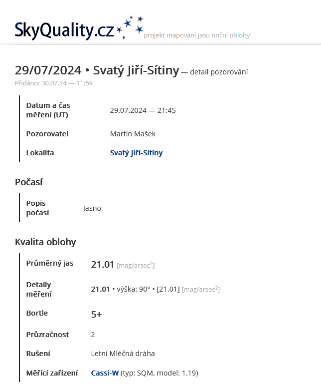 Po více než měsíci, kdy nad územím ČR nenastávala astronomická noc, se nám včera naskytla opět příležitost, toto měření provést. Jas oblohy nad našimi pozorvacími stanovišti je i letos uspokojivý. http://www.skyquality.cz/observation/show?observationId=2068 http://www.skyquality.cz/observation/show?observationId=2070