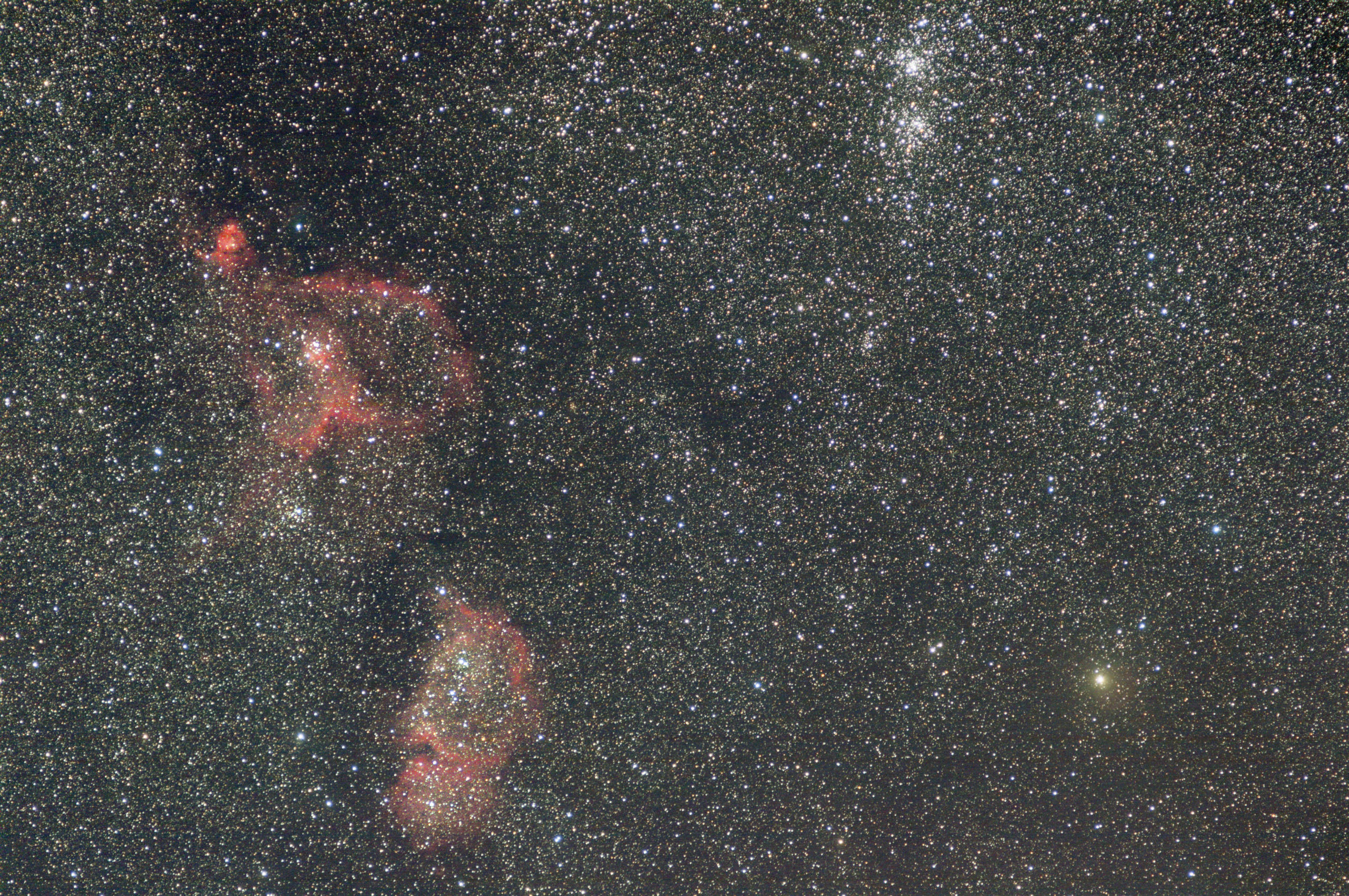 Během hojného množství letošních jasných nocí se našel čas vyfotit i mlhovinu Srdce, Duše a dvojitou hvězdokupu X a h v Perseovi. 111 x 60 s na Canon EOS 40D; 135 mm f/3,5