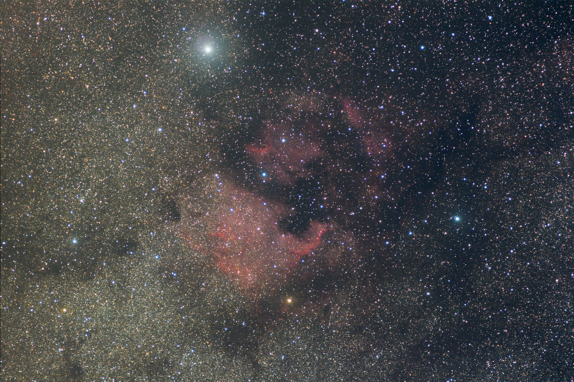 První noc s modifikovanou zrcadlovkou jsem nemohl strávit focením ničeho jiného, než mlhoviny Severní Amerika, nacházející se u na fotce přítomného Denebu – ocasu Labutě. 80 x 60 s na Canon EOS 40D; 135 mm f/3,5